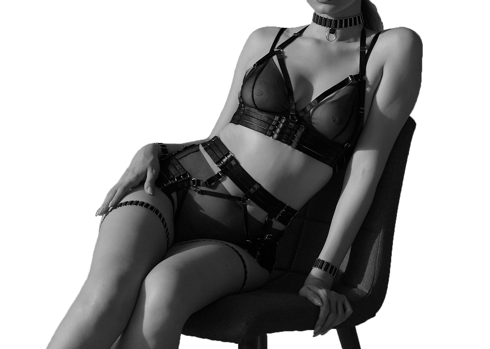 Lady of the Night lace lingerie set with crotchless panties and garters black