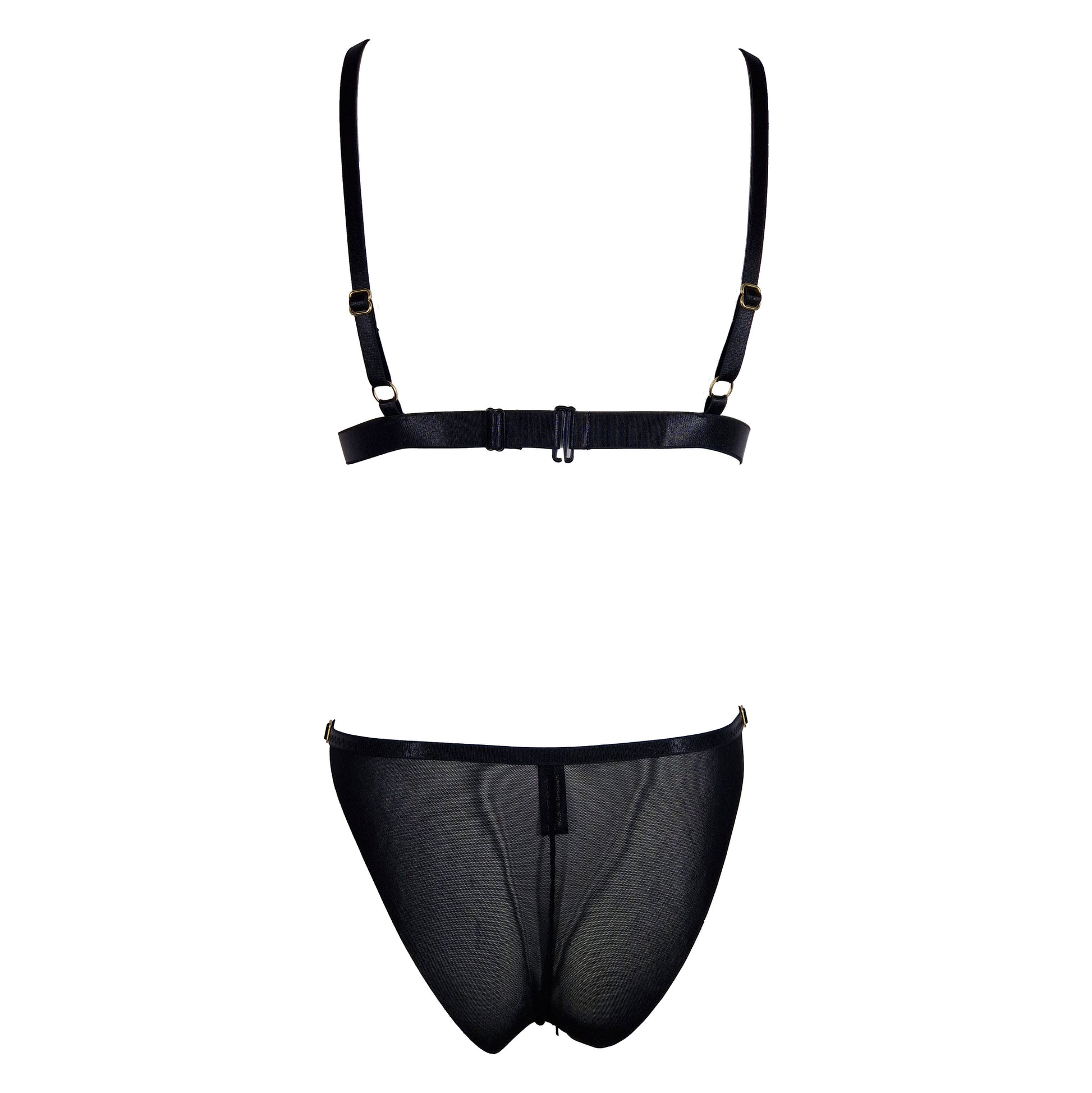 Handmade elastic tulle lingerie set in black with copper sequin patches