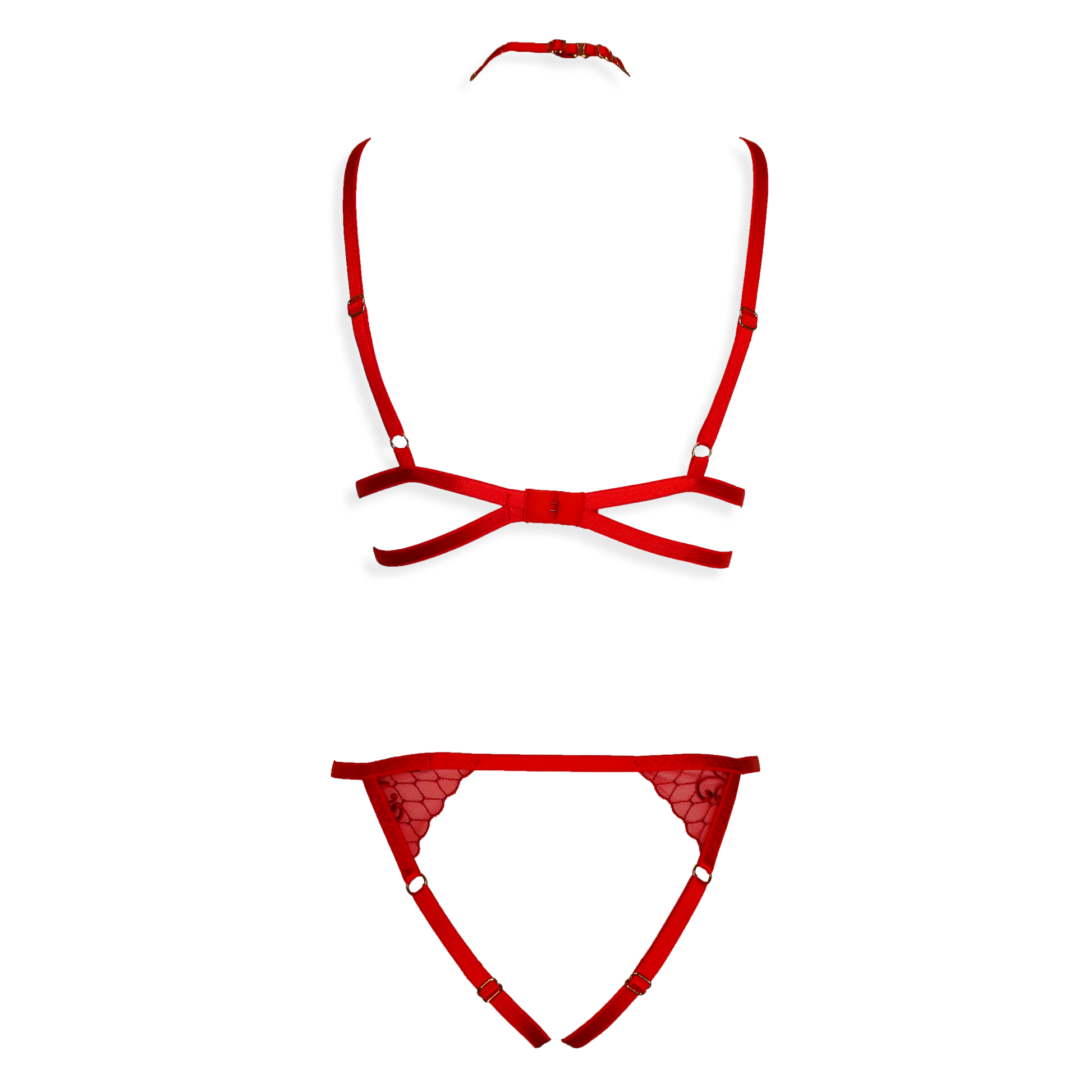 Simone lace lingerie set with crotchless panties and detachable choker red